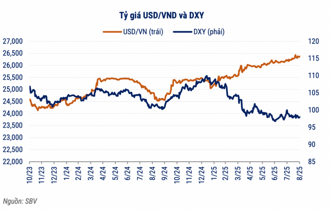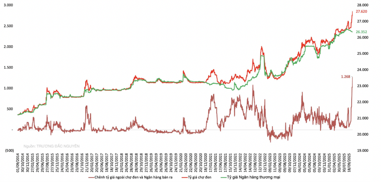 Đây là một biểu đồ khá quen thuộc mà tôi hay sử dụng để đưa ra minh chứng cho luận điểm VND đang mất giá như thế nào và điều đó là nguyên nhân chính khiến cho tỷ giá USD/VND tăng mạnh hơn nửa năm nay (lưu ý tỷ giá này là tỷ giá in-system, chứ chưa xét tỷ giá tự do ngoài thị trường). Còn độc giả nào muốn tìm hiểu kỹ hơn vấn đề tại sao tỷ giá lại tăng như vậy thì có thể tìm đến bài (CHÍNH SÁCH TIỀN TỆ 2025: TỶ GIÁ MẤT PHANH, VÀNG BỨT TỐC, SBV ĐI NƯỚC CỜ NGƯỢC?, Tại sao giá đô lại lên cao 27000 VNĐ?)