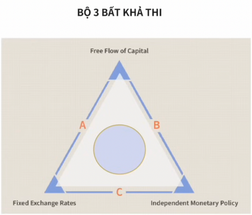 Bộ ba bất khả thi (The Impossible Trinity) phát biểu rằng một quốc gia không thể đồng thời đạt được cả ba yếu tố về vĩ mô như tôi đã nêu ở trên, mà họ sẽ phải chịu một sự trade-off (chỉ có đạt được 2/3 yếu tố ở trên).
