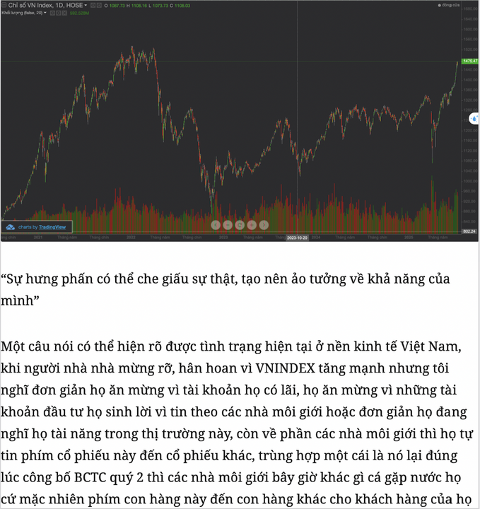 Trong bài đó, tôi từng nêu một nhận định có thể xem là “không thuận tai” với nhiều người lúc ấy rằng đà tăng của thị trường chứng khoán Việt Nam không đến từ sức khỏe nội tại của nền kinh tế, mà chủ yếu xuất phát từ tâm lý hưng phấn ngắn hạn và dòng tiền tín dụng hay nói thẳng ra là “ảo”. Quan điểm này khi ấy từng khiến tôi tranh luận khá căng với vài người trong team Diocofin, những người tin rằng “tăng là tăng, dòng tiền vào là tín hiệu tích cực”. Còn tôi thì… give a fuck :))), vì tôi tin rằng nếu không chỉ ra bản chất thật, thì người viết tài chính chẳng khác gì một “người kể chuyện dễ nghe”, mà thị trường thì không thiếu những câu chuyện như vậy.