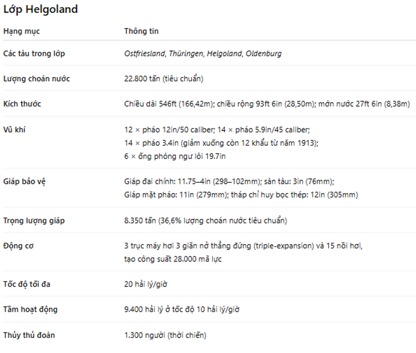Khi cuộc chạy đua hải quân với Anh gia tăng, Đức đặt lườn bốn chiếc thuộc lớp Helgoland vào năm 1908. Vì thời gian là yếu tố quyết định, lớp này được phát triển dựa trên lớp Nassau với chỉ vài cải tiến nhỏ. Thay đổi lớn nhất là việc chuyển sang dùng pháo chính 305mm (12 inch) nhằm bù đắp lợi thế trọng lượng đạn bắn bên mạn của Anh. Cách bố trí dàn pháo chính giống với lớp Nassau, nên vẫn chỉ tám khẩu có thể khai hỏa mạn tàu. Pháo hạng hai gồm 14 khẩu 150mm, đặt trong hốc pháo đơn.