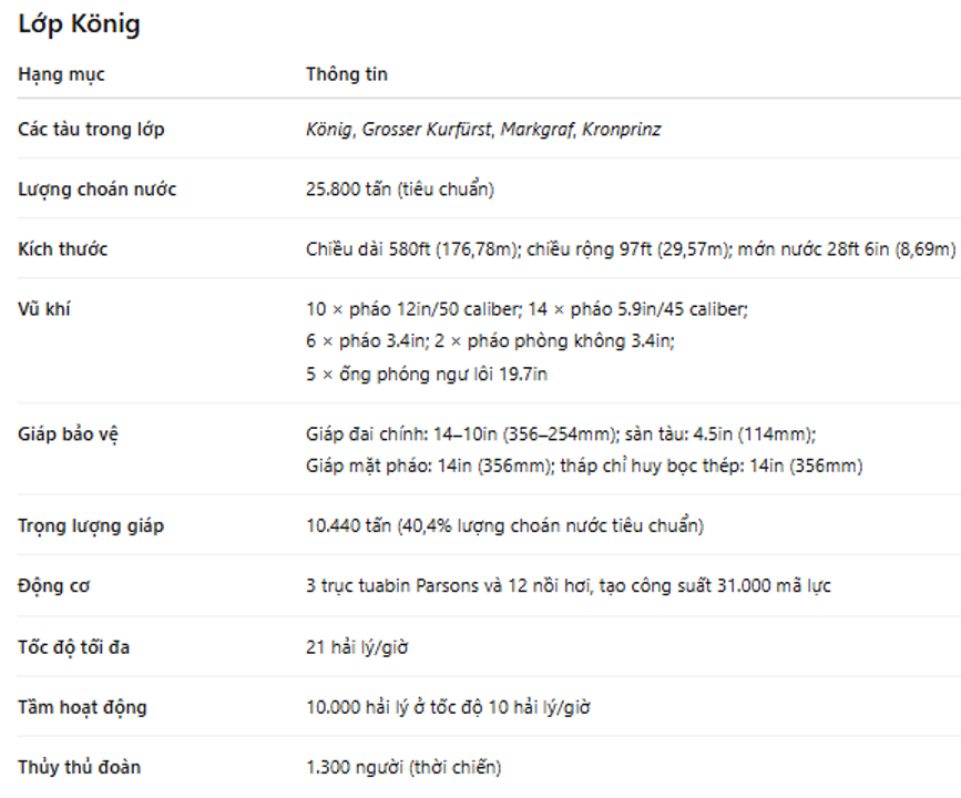 Bốn chiếc thuộc lớp König được đặt lườn vào năm 1911 và đến trận Jutland là những dreadnought hiện đại nhất của Hạm đội Biển khơi. Lớp này giữ nguyên pháo chính gồm mười khẩu 305mm, lắp trong năm tháp pháo. Tuy nhiên, cách bố trí hai tháp pháo giữa ở lớp Kaiser được thay bằng phương án lắp tất cả trên trục giữa. Tháp pháo giữa được đặt giữa hai ống khói, cho phép tàu khai hỏa trọn vẹn mười khẩu ở loạt bắn mạn—lần đầu tiên một dreadnought Đức đạt được điều này. Pháo hạng hai vẫn gồm 14 khẩu 150mm đặt đơn trong hốc pháo.