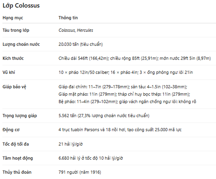 Hai chiếc sau của lớp, Colossus và Hercules, không được đặt lườn cho đến tháng 7 năm 1909 nên có thể tích hợp vài sửa đổi. Khác biệt chính là ở lớp giáp. Để tiết kiệm trọng lượng, các lớp sau Dreadnought có giáp mỏng hơn. Colossus và Hercules được cải thiện giáp đến 11 inch ở dây lưng tàu và tháp pháo, đưa mức bảo vệ trở lại ngang với Dreadnought. Hải quân Anh vẫn tin rằng ngư lôi là vũ khí quan trọng trong giao chiến giữa thiết giáp hạm, nên bắt đầu trang bị ngư lôi 21 inch có tầm bắn xa hơn. Hình dáng của hai tàu này cũng được điều chỉnh. Ở các thiết kế trước, ống khói đặt gần cột buồm sau khiến đài chỉ huy phía sau không sử dụng được do khói. Về sau, cột buồm sau được dỡ bỏ để làm giảm trọng lượng. Tuy nhiên, ống khói phía trước lại đặt ngay trước cột buồm trước, gây ra vấn đề tương tự và làm cho đài chỉ huy duy nhất còn lại gần như vô dụng.