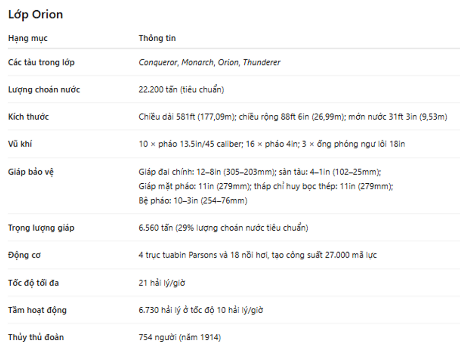 Cuối năm 1909, chiếc đầu tiên trong bốn tàu lớp Orion được đặt lườn. Cả bốn chiếc đi vào hoạt động vào năm 1912. Đây là thiết kế thiết giáp hạm tốt nhất của Anh cho đến thời điểm đó, mang lại bước tiến đáng kể. Khác biệt chính là việc chuyển sang pháo 13.5 inch. Dù vẫn giữ mười khẩu pháo, lần đầu tiên cả năm tháp được đặt trên trục trung tâm, cho phép bắn mười khẩu theo hướng mạn. Các tháp pháo đặt tầng trước và sau, nhưng được khuyến cáo không bắn trực diện do nguy cơ gây chấn động cho kíp pháo dưới. Tuy nhiên, nhược điểm này được coi là không đáng kể so với lợi thế của loạt pháo mạn đầy đủ. Giáp bảo vệ dây lưng và tháp pháo cũng được tăng cường, tạo nên sự cân bằng tốt giữa công – thủ. Lỗi thiết kế cố hữu vẫn là ống khói trước đặt ngay trước cột buồm chính, gây cản trở việc chỉ huy hỏa lực.