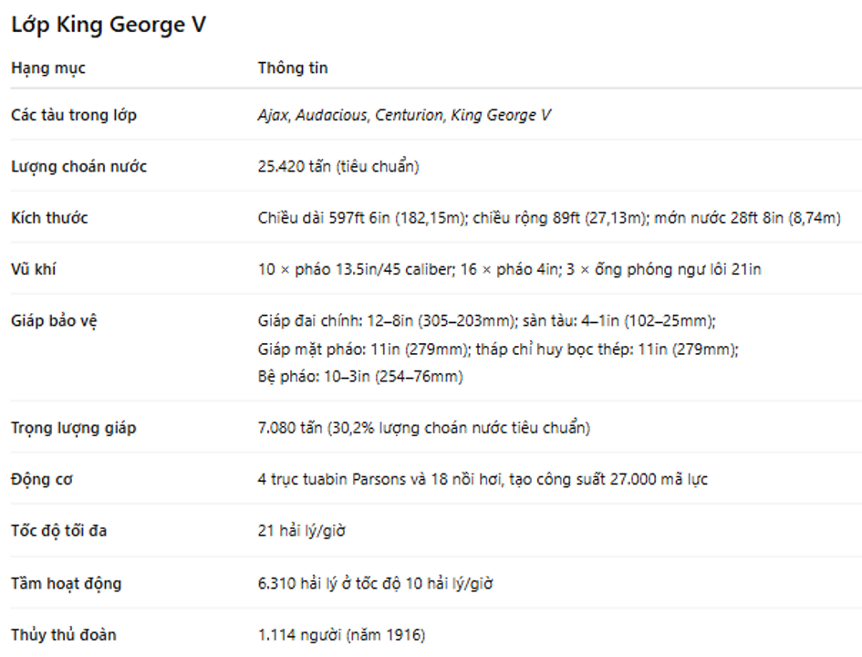 Bốn tàu lớp King George V được đặt lườn trong năm 1911 và đi vào hoạt động vào năm 1913. Đây là bản lặp của lớp Orion. Dàn pháo chính vẫn giữ nguyên, nhưng trang bị phiên bản cải tiến của pháo 13.5 inch, bắn đạn nặng hơn. Hỏa lực phụ vẫn không đủ để chống lại tàu phóng lôi và khu trục. Bố trí 16 pháo 4 inch được sửa đổi, bao gồm bốn khẩu đặt dưới boong chính phía trước. Tuy nhiên, các khẩu này không thể sử dụng hiệu quả trong điều kiện biển động và bị tháo bỏ trong chiến tranh.