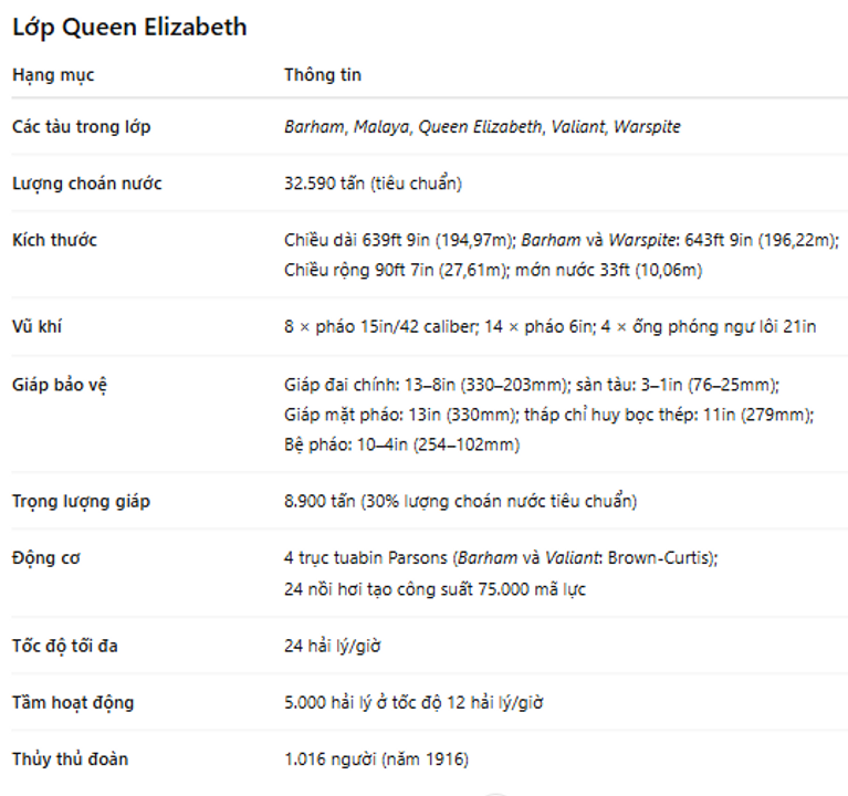 Năm tàu lớp Queen Elizabeth là những thiết kế thành công nhất của Anh trong Thế chiến I. Được đặt lườn năm 1912–13, tất cả đều hoàn thành và tham chiến trong trận Jutland. Còn tàu dẫn đầu đang bảo trì khi trận Jutland đang diễn ra, nhưng bốn tàu còn lại đều đối đầu với Hạm đội Biển khơi Đức. Thiết kế tích hợp nhiều cải tiến quan trọng. Quan trọng nhất là việc từ bỏ hệ thống nhiên liệu hỗn hợp than - dầu để chuyển hoàn toàn sang nhiên liệu dầu. Quyết định này giúp tăng công suất đạt tốc độ 25 hải lý/giờ mà không cần tăng trọng lượng máy móc. Nhờ đó, trọng lượng tiết kiệm được chuyển sang tăng cường lớp giáp. Kết quả là một hải đoàn thiết giáp cao tốc có lớp giáp tốt được ra đời. Bộ Hải quân kỳ vọng "Hải đoàn tốc độ cao" này sẽ buộc đối phương ra khỏi cảng giao chiến, và nhờ tốc độ cao, chúng có thể tác chiến cùng với đội thiết giáp tuần dương hạm.