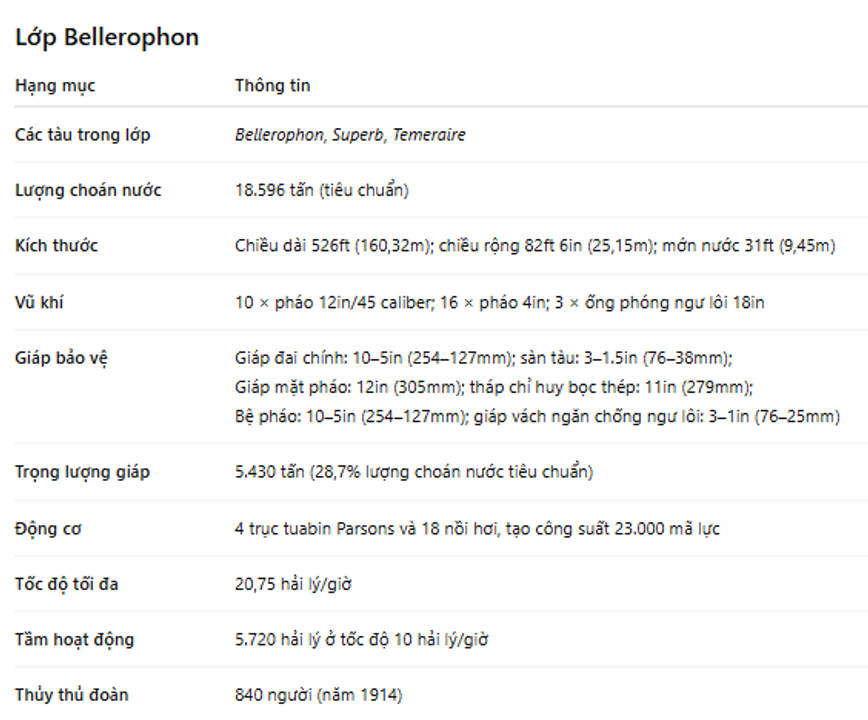Sau các cuộc thử nghiệm thành công của chiếc Dreadnought, người Anh nhanh chóng hành động nhằm xây dựng ưu thế số lượng thiết giáp hạm hạng dreadnought vượt trội so với bất kỳ đối thủ tiềm tàng nào. Tàu dẫn đầu lớp Bellerophon được đặt lườn vào tháng 12 năm 1906 và cả ba chiếc trong lớp đều được hoàn thành vào tháng 5 năm 1909. Các tàu lớp Bellerophon gần như sao chép nguyên mẫu Dreadnought. Dàn pháo chính gồm mười khẩu pháo 12 inch được bố trí trong năm tháp pháo, ba tháp đặt trên trục trung tâm. Hai tháp còn lại là tháp pháo bên mạn, cho phép khai hỏa tám khẩu cùng lúc theo hướng mạn tàu. Hỏa lực phụ thì yếu kém, chỉ có 16 khẩu pháo 4 inch – không đủ để chống lại các cuộc tấn công của tàu khu trục. Thêm vào đó, vị trí đặt pháo rất kém: tám khẩu đặt trên nóc các tháp pháo chính. Đến năm 1916, toàn bộ pháo 4 inch được chuyển lên các vị trí khả dụng hơn trong cấu trúc thượng tầng.