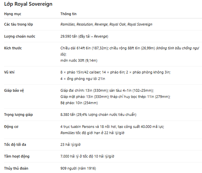 Kế thừa lớp Queen Elizabeth là tám tàu lớp Revenge (hoặc lớp Royal Sovereign). Trong đó chỉ có năm chiếc hoàn thành, và chỉ hai tàu (Revenge và Royal Oak) tham chiến ở Jutland. Lớp này giữ nguyên giáp và pháo chính 15 inch, nhưng không có tốc độ cao như lớp trước.