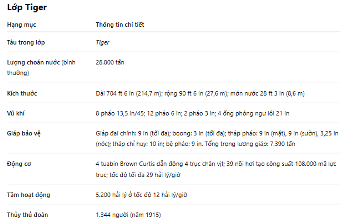 Thiết giáp tuần dương hạm Tiger – lớp tàu một chiếc – là con tàu tốt nhất của Anh tham chiến trong chiến tranh và cũng là thiết kế cuối cùng trước chiến tranh. Theo chương trình năm 1911, Tiger được đặt lườn vào tháng 6 năm 1912, nhưng đến tháng 10 năm 1914 – sau khi chiến tranh bắt đầu – mới được đưa vào hạm đội. Ngay cả lúc đó, tàu vẫn được đưa vào hoạt động trong tình trạng gấp rút và chưa hoàn thiện, điều được phản ánh qua màn thể hiện yếu kém tại trận Dogger Bank.