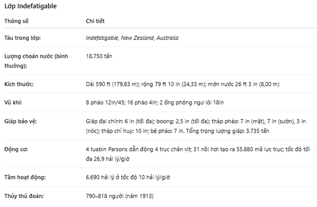 Chiếc đầu tiên trong ba tàu thuộc lớp Indefatigable được đặt lườn vào đầu năm 1909 và hoàn tất hai năm sau đó. Chiếc tàu trong ảnh là HMS New Zealand – một tàu lớp Indefatigable được đóng cho Hải quân Hoàng gia New Zealand, nhưng sau đó được trao tặng cho Hải quân Hoàng gia Anh khi hoàn tất vào năm 1912. Hàng hai tầng cửa sổ tròn (porthole) cho thấy rằng đai giáp của tàu không bao phủ phần lớn thân tàu; điều này, kết hợp với độ sâu của đai giáp quá hạn chế, khiến con tàu bị xem là thiếu khả năng phòng vệ nghiêm trọng. (Thư viện Tiểu bang Nam Úc / CC-BY-2.0).