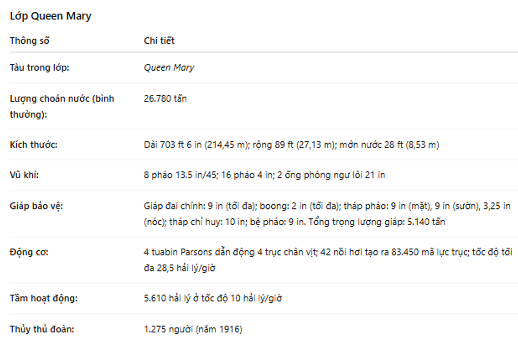 Còn tàu được đặt lườn tháng 3 năm 1911 và bàn giao cho Hải quân Hoàng gia vào tháng 8 năm 1913. Tàu đang trong quá trình sửa chữa đầu năm 1915 nên không tham gia trận Dogger Bank. Tại Jutland, Queen Mary bị đánh chìm với chỉ chín người sống sót.