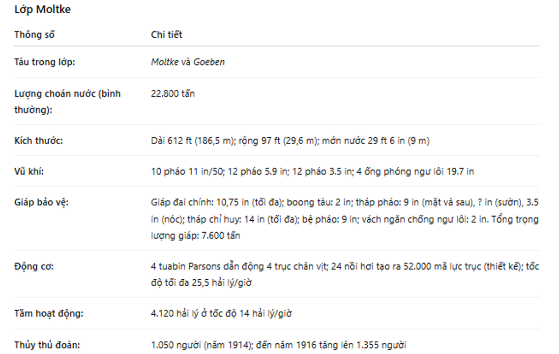 Hai tàu của lớp này, Moltke và Goeben, cũng được đóng tại xưởng Blohm und Voss ở Hamburg và cùng được đưa vào phục vụ năm 1912. Thiết kế của lớp này được đánh giá là rất hiệu quả trong thực tiễn và cả hai tàu đều có sự nghiệp thành công. Moltke là trụ cột trong hải đoàn của Hipper và sống sót qua chiến tranh. Sau khi bị trao nộp, còn tàu tự đánh chìm năm 1919, được trục vớt năm 1927 và tháo dỡ năm 1929.
