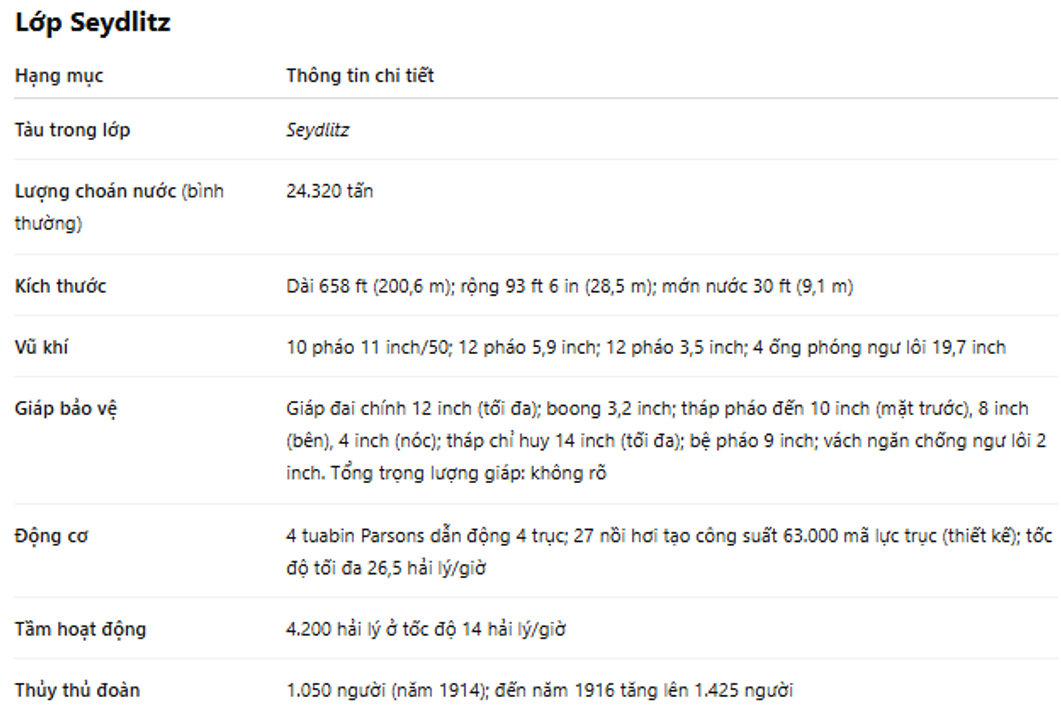 Seydlitz được đặt đóng tại Blohm und Voss và hoàn tất vào năm 1913. Còn tàu tham gia mọi trận chiến lớn của Hải đoàn thiết giáp tuần dương hạm Đức và chịu tổn thất nặng nề tại Jutland nhưng vẫn sống sót. Tàu bị đánh chìm tại Scapa Flow năm 1919, sau đó được trục vớt và tháo dỡ vào năm 1928.