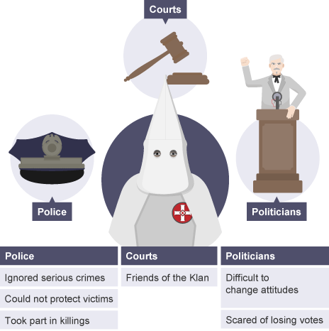 Trong những năm 1860 và 1870, tổ chức Ku Klux Klan (KKK) được sử dụng như một lực lượng bán quân sự, thực hiện các hành động khủng bố nhằm vào người Mỹ gốc Phi, những người đang đấu tranh giành quyền bầu cử và bình đẳng. Các chính trị gia từ Washington đã đến miền Nam, với vỏ bọc là những người bảo vệ "truyền thống", đã bí mật gặp gỡ các thủ lĩnh KKK đưa ra chỉ thị. KKK không chỉ là biểu tượng của thù hận, mà còn là công cụ để nhóm chính trị gia ( tạm gọi là đầm lầy Washington) giữ vững quyền lực trong một xã hội đang rối loạn sau chiến tranh.