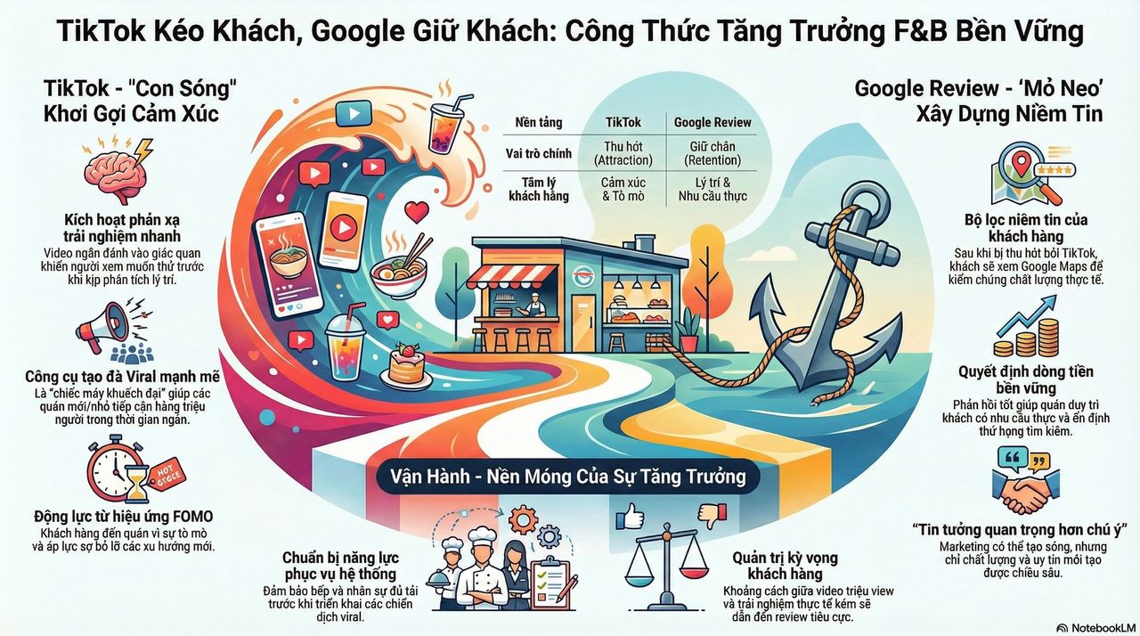 TikTok giống như một con sóng. Nó đẩy thuyền đi nhanh. Nhưng Google Review là mỏ neo. Nó giữ con thuyền đứng vững khi gió đổi chiều.