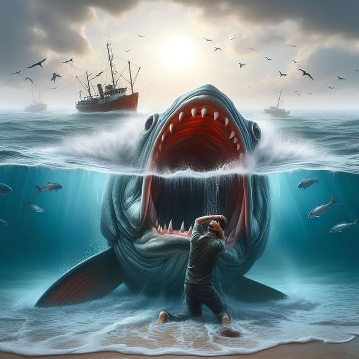 Đấy là giờ đồng hồ đầu tiên trước khi con cá mập tấn công. Con cá mập này không phải là tình cờ. Nó ngoi lên từ phía biển sâu khi đám mây máu đen sẫm được hình thành rồi lan nhanh xuống vùng nước sâu hơn ngàn thước. Nó là loài cá mập Mako cực lớn, mọi thứ trên người nó đều đẹp chỉ trừ bộ hàm. "Cái quá tốt đẹp thì chẳng bền", tôi nghĩ. Tôi không thể ngăn nó đừng tấn công nhưng có lẽ mình sẽ giết được nó. Con cá mập áp nhanh mạn thuyền và khi nó đớp con cá, tôi trông thấy cái mồm rộng, đôi mắt kì lạ và hàm răng bổ đánh cách một tiếng. Tôi cắm phập mũi lao xuống đầu con cá mập, ngay điểm giao nhau giữa những đường kẻ ngang mắt và đường chạy thẳng từ mũi nó vắt ra sau. Tôi đâm bằng cả hai bàn tay tứa máu, dốc hết sức lực ấn sâu mũi lao xuống. Con cá mập nằm phơi bụng lên trời, đuôi quật mạnh, hai hàm răng đớp cạch cạch. Rồi nó lặn xuống, rất chậm. "Nó đớp khoảng hai mươi cân rồi", tôi nói lớn. Nó cũng đoạt luôn mũi lao và cả dây nữa.
