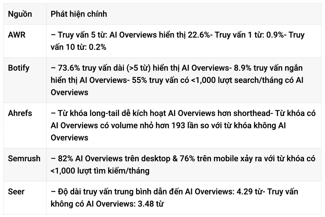 - AI Overviews trung bình dài khoảng 90-170 ký tự: