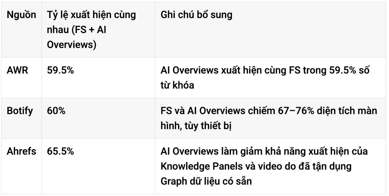 - Sistrix: Các trích dẫn nổi bật trong AI Overviews dẫn đến nhiều nhấp chuột hơn so với Featured Snippets, nhưng vẫn ít hơn nhiều so với các kết quả tìm kiếm truyền thống.