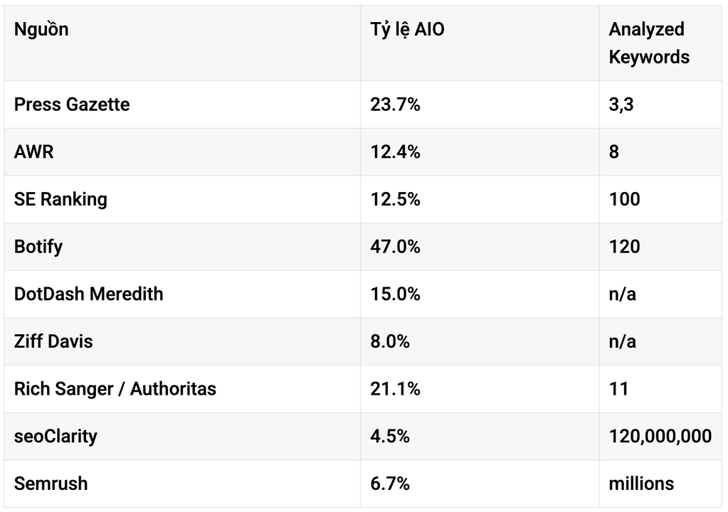% từ khóa hiển thị AI Overviews theo các nguồn nghiên cứu