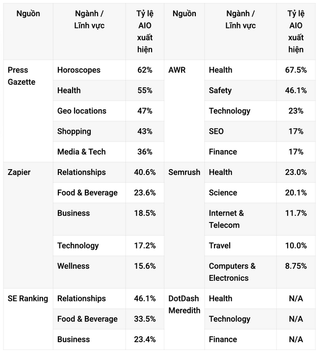 Tỷ lệ xuất hiện AI Overviews theo ngành