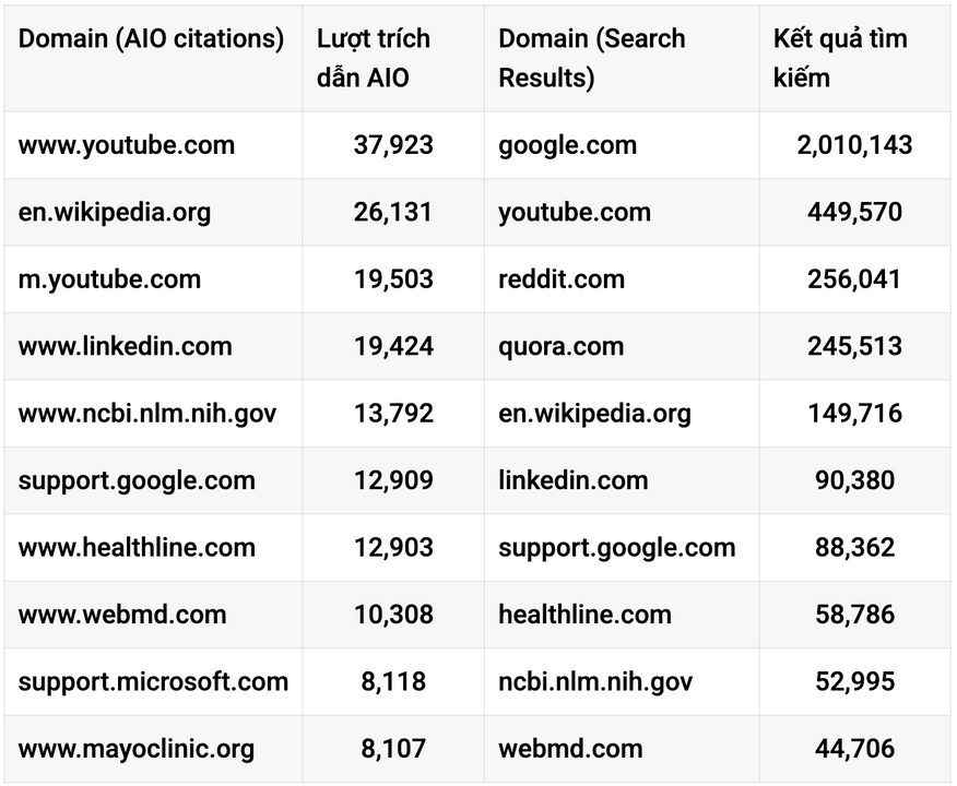 Top Domains xuất hiện trong AI Overviews và số lượng kết quả tìm kiếm