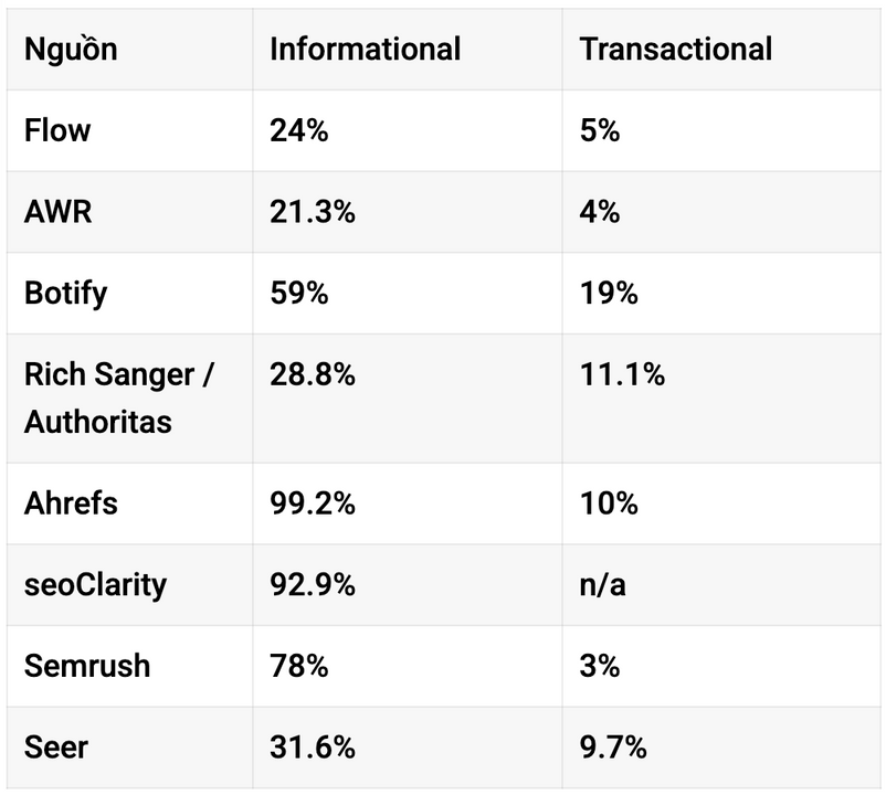 - Rich Sanger / Authoritas: 28.8% từ khóa hiển thị AIO là thông tin so với 11.1% thương mại / giao dịch.