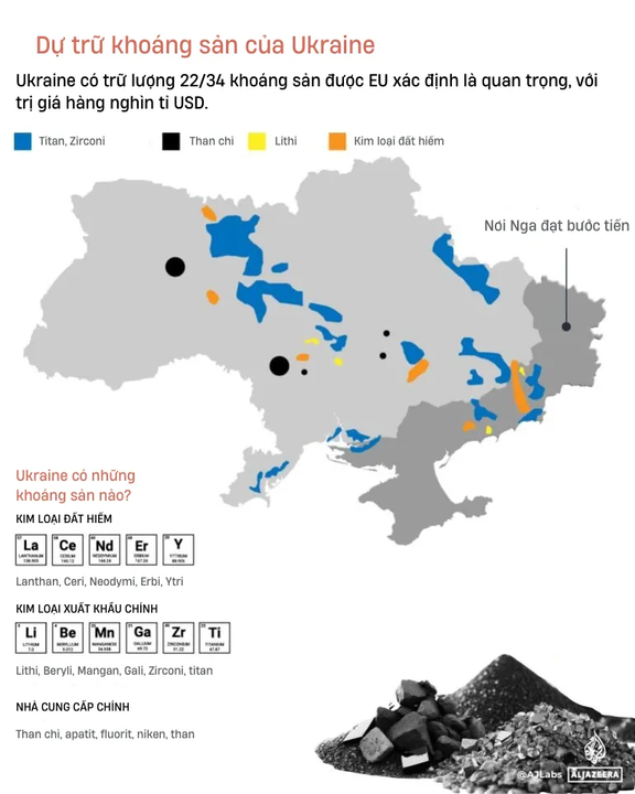 - Tài nguyên tại vùng chiến sự: Các khu vực phía Đông Ukraine (như Donbas) không chỉ có vị trí địa lý quan trọng mà còn chứa đựng trữ lượng lớn khoáng sản, bao gồm lithium và đất hiếm.