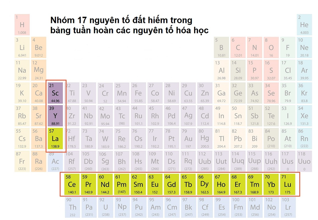 - 2 “người họ hàng xa”: Scandium (Sc) và Yttrium (Y). Dù không nằm trong chuỗi Lanthanides, nhưng chúng luôn đi cùng với 15 anh em kia trong các mỏ quặng và có tính chất hóa học tương tự, nên được các nhà khoa học xếp chung vào một nhóm.