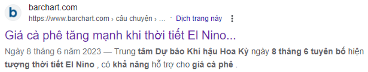 Ngày 8/6/2023, Trung tâm Dự báo Khí hậu Mỹ tuyên bố hiện tượng thời tiết El Nino, nhiều khả năng sẽ hỗ trợ giá cà phê vì nhiệt độ bề mặt nước biển trên vùng xích đạo Thái Bình Dương đã tăng 0,5 độ C so với bình thường việc sẽ tạo ra mưa lớn ở Brazil và hạn hán ở Ấn Độ, tác động tiêu cực này ảnh sẽ ảnh hưởng đến hoạt động sản xuất cà phê.