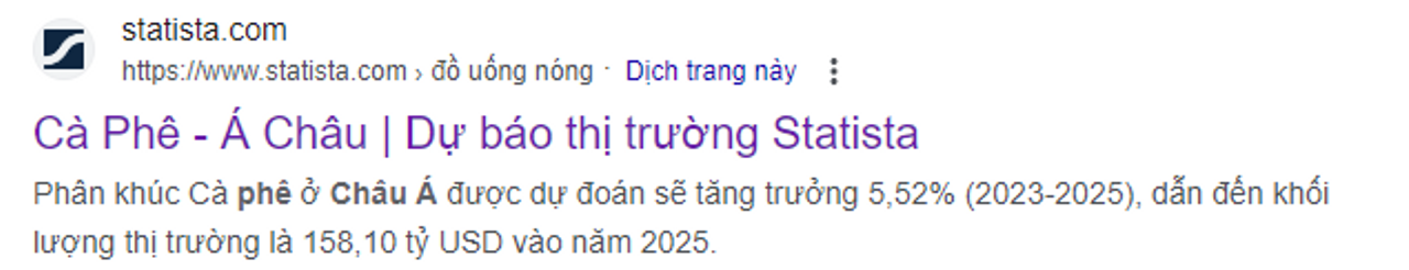 Cộng thêm việc xu hướng tiêu thụ cà phê đang tăng trưởng mạnh ở châu á, cụ thể là sẽ tăng trưởng 5.52% từ 2023 - 2025