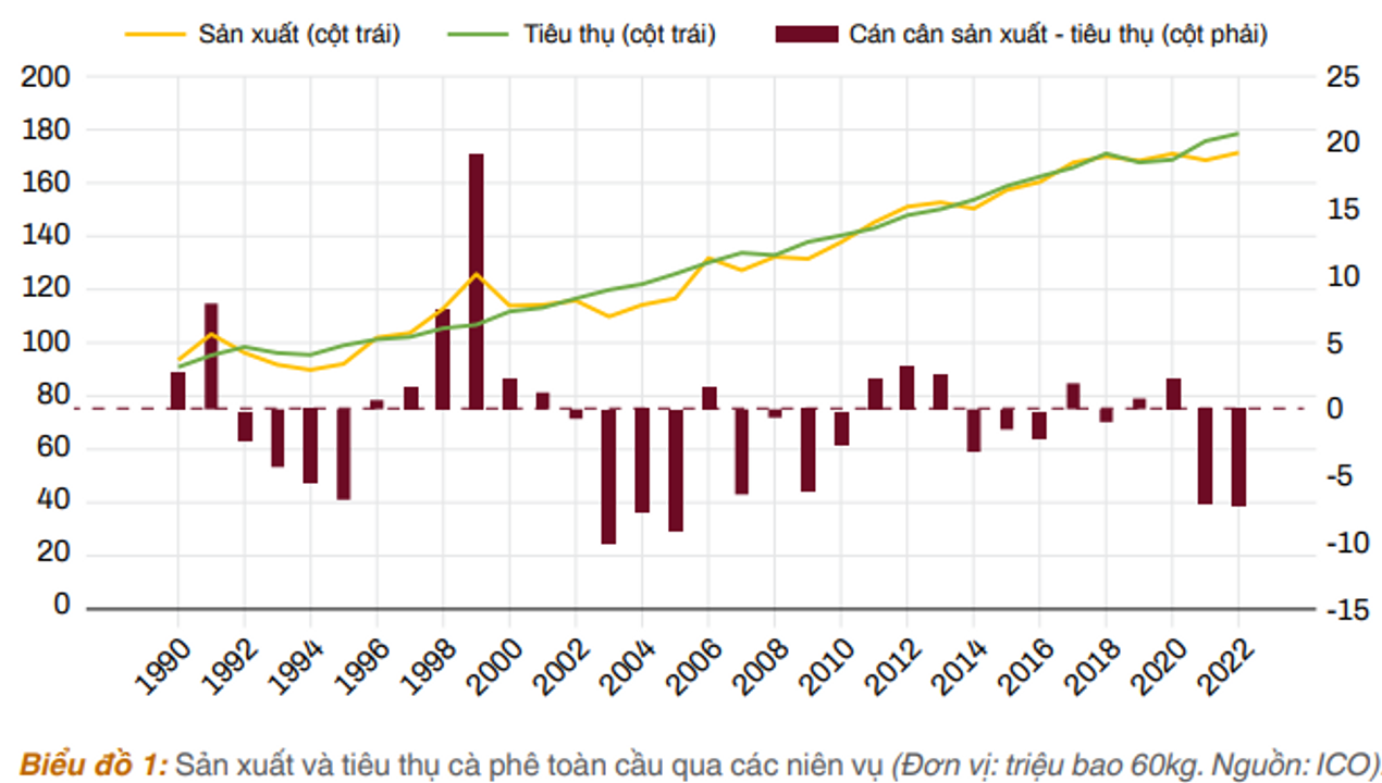 Theo Tổ chức Cà phê Quốc tế (ICO), sản lượng cà phê toàn cầu trong niên vụ 2022-2023 dự báo đạt khoảng 171,3 triệu bao trong khi nhu cầu tiêu thụ lên đến 178,5 triệu bao. Do đó, thị trường cà phê toàn cầu sẽ chứng kiến mức thâm hụt 7,3 triệu bao trong niên vụ 2022-2023.