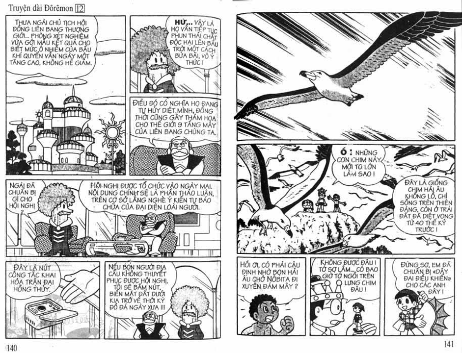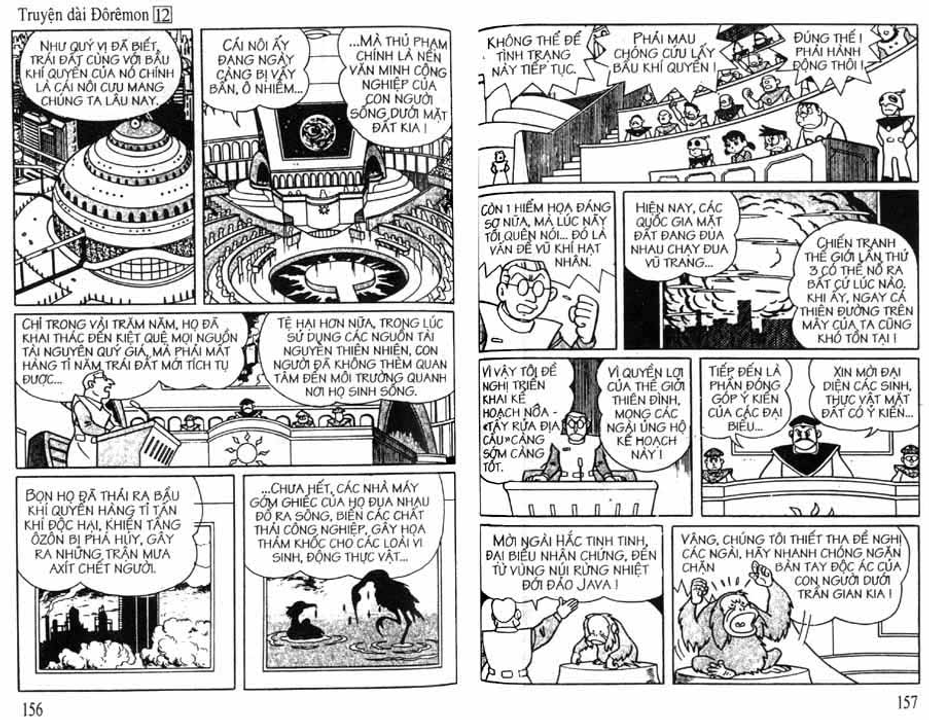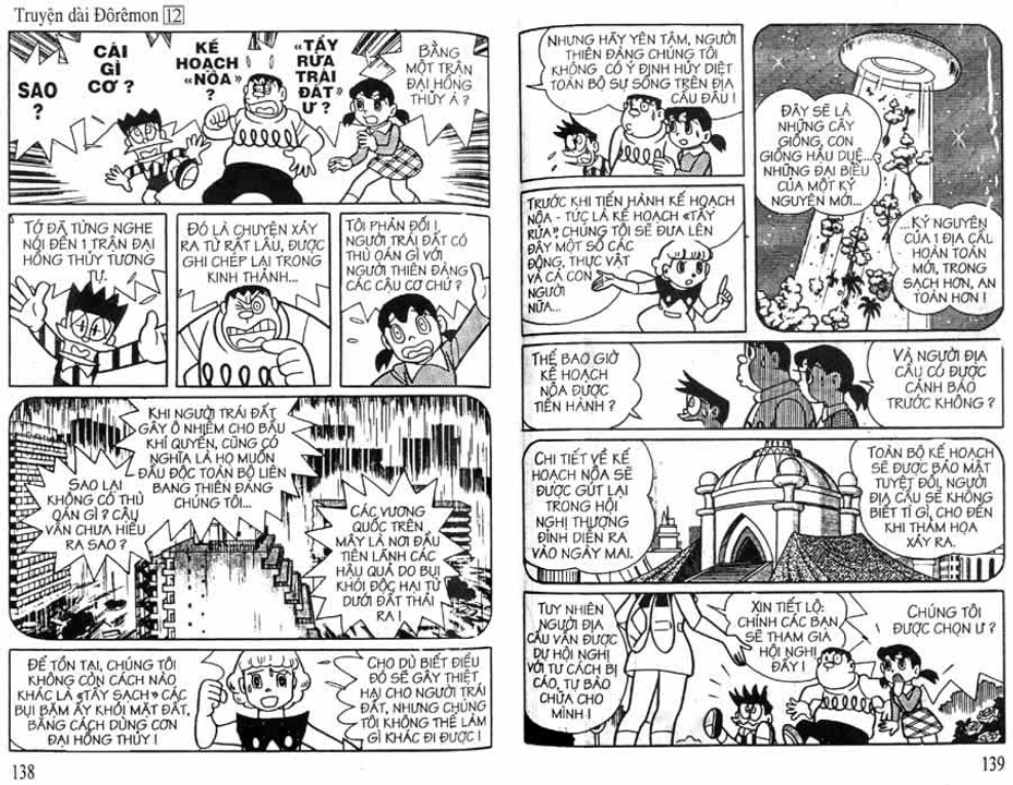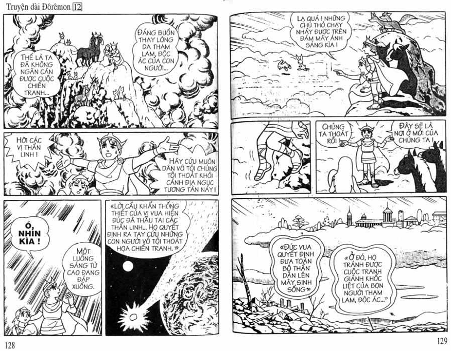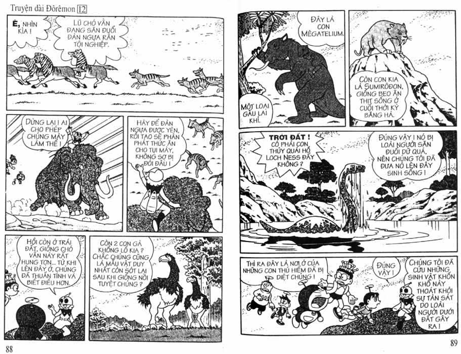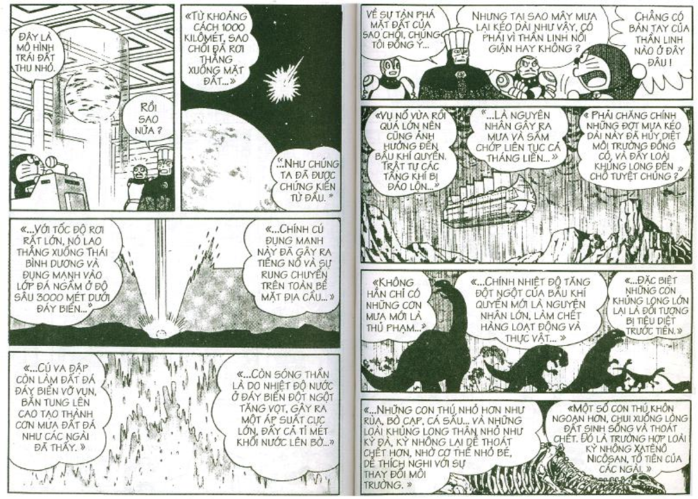 Cụ thể trong các cuốn truyện dài, nhóm Doraemon đã gặp mặt và có những trải nghiệm đối với 3 vùng không gian trong sinh quyển địa cầu bao gồm: đáy biển, lòng đất và bầu trời, tương ứng họ gặp 3 tộc người là: Người Đáy Biển - Tập 4 Lâu Đài Dưới Đáy Biển (hậu duệ của cư dân hai lục địa bí ẩn tương truyền đã biến mất trên thế giới là lục địa Mu và lục địa Atlantis), Người Kỳ Nhông - Tập 8 Cuộc Phiêu Lưu Vào Lòng Đất (hậu duệ của loài khủng long đã chui xuống lòng đất sau thảm họa 65 triệu năm trước và tiến hóa) và Người Thiên Đường - Tập 12 Vương Quốc Trên Mây (theo truyền thuyết thì họ được thần linh cứu rỗi sau khi diệt quốc và một bước lên mây sinh sống)