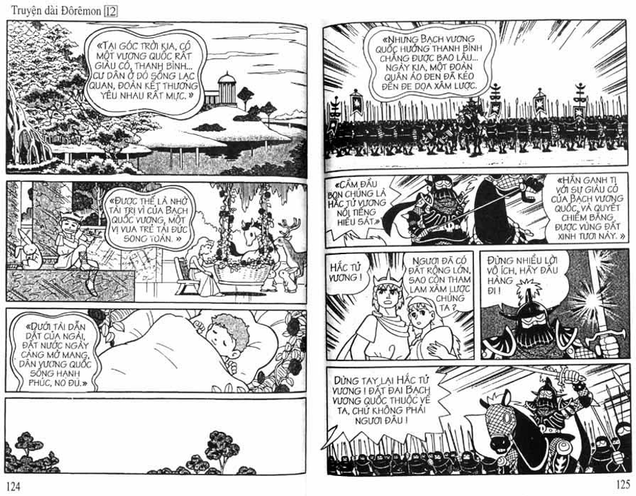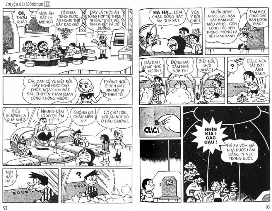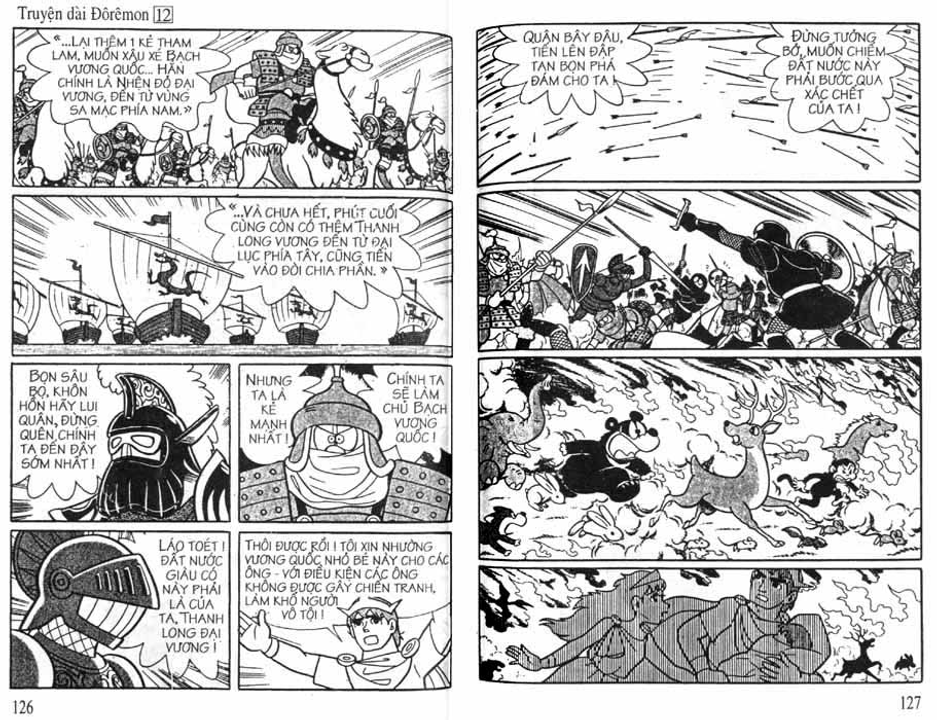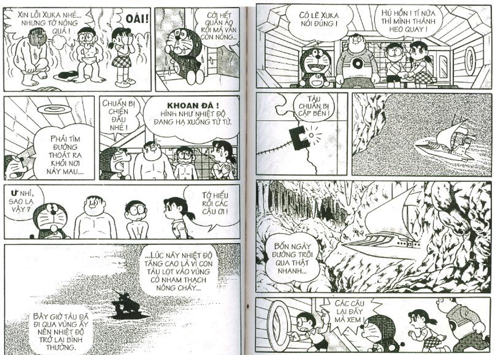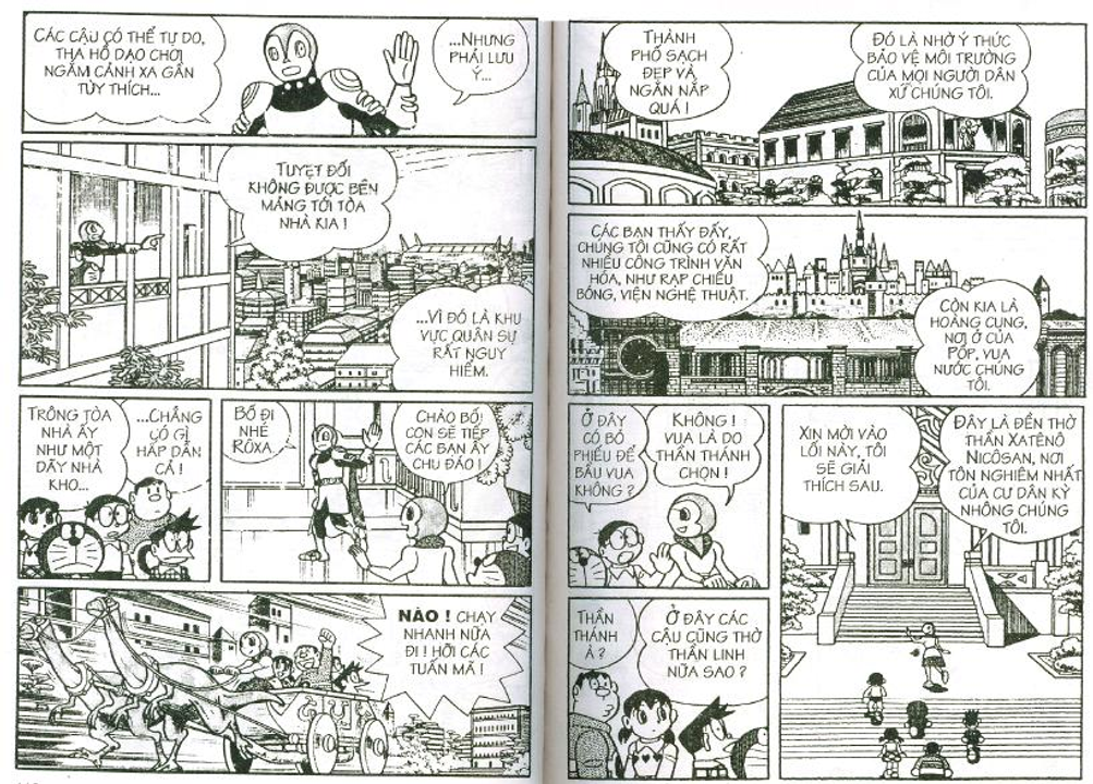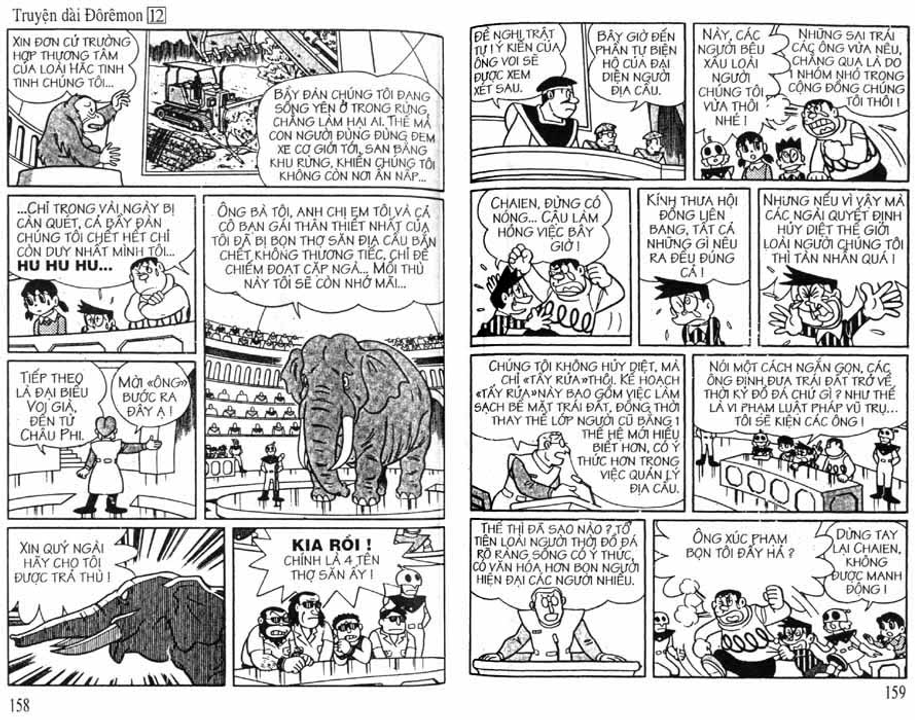 Cụ thể trong các cuốn truyện dài, nhóm Doraemon đã gặp mặt và có những trải nghiệm đối với 3 vùng không gian trong sinh quyển địa cầu bao gồm: đáy biển, lòng đất và bầu trời, tương ứng họ gặp 3 tộc người là: Người Đáy Biển - Tập 4 Lâu Đài Dưới Đáy Biển (hậu duệ của cư dân hai lục địa bí ẩn tương truyền đã biến mất trên thế giới là lục địa Mu và lục địa Atlantis), Người Kỳ Nhông - Tập 8 Cuộc Phiêu Lưu Vào Lòng Đất (hậu duệ của loài khủng long đã chui xuống lòng đất sau thảm họa 65 triệu năm trước và tiến hóa) và Người Thiên Đường - Tập 12 Vương Quốc Trên Mây (theo truyền thuyết thì họ được thần linh cứu rỗi sau khi diệt quốc và một bước lên mây sinh sống)