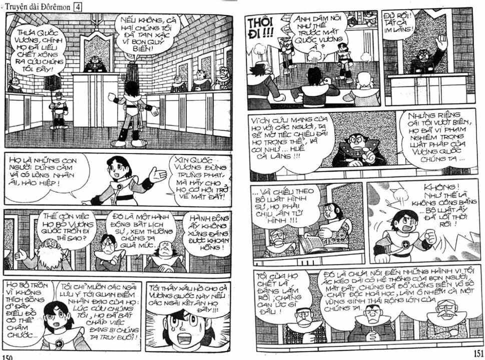 Thứ ba, là phiên tòa xử tội nhóm Doraemon vì hành vi vượt biên, sử dụng bộ luật 5000 năm tuổi để định tội 5 đứa trẻ, bị cáo không được xuất hiện, không được biện hộ, chỉ có một người bào chữa thì lại là cậu nhóc Eru cũng là tộc người đáy biển, người đáy biển duy nhất còn thiện cảm với người mặt đất, còn lại là các quan tòa mõm tuyên án tử hình cho 5 đứa trẻ chỉ vì những định kiến của họ về người mặt đất không hề liên quan đến 5 đứa nhỏ, không hề đưa ra được lý do thuyết phục nào cho việc ông đi tuyên án tử hình 5 mạng người, đúng kiểu xem mạng sống con người như cỏ rác.