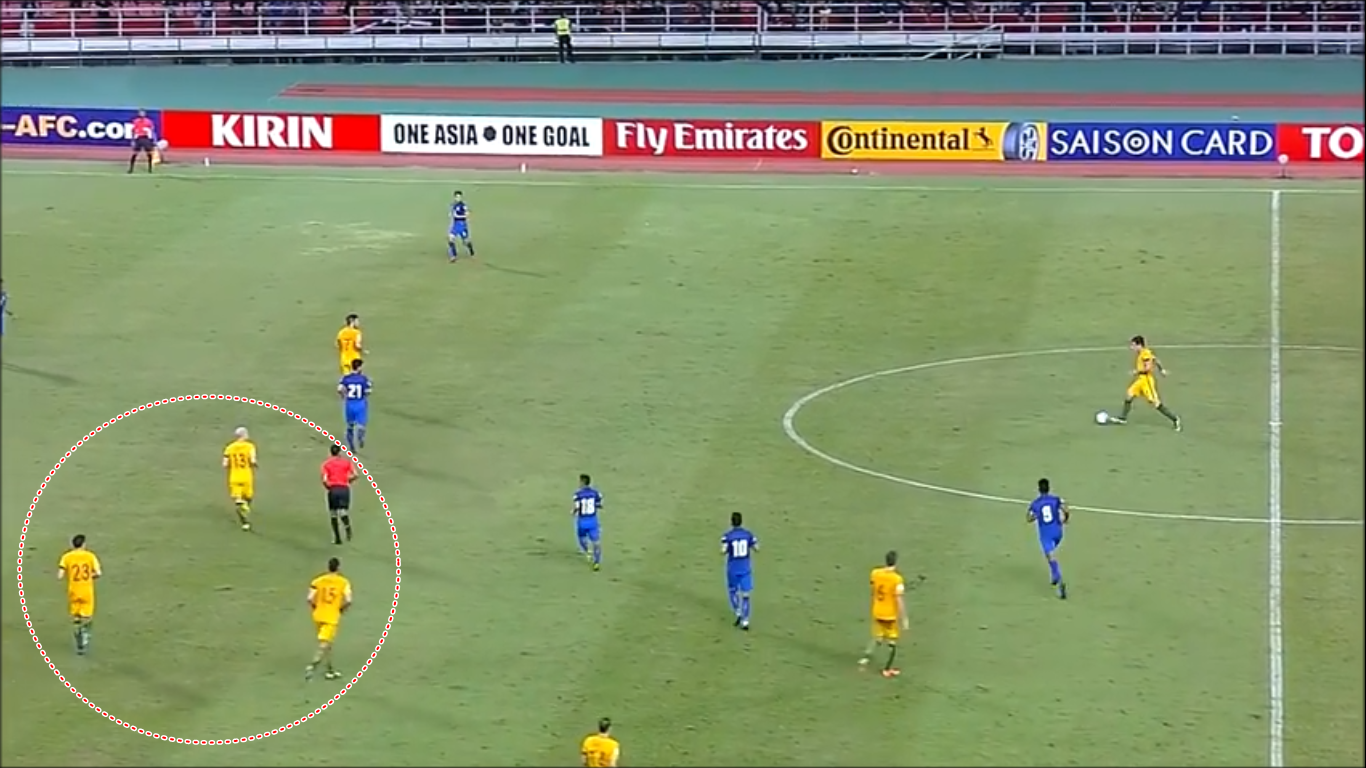 Tình huống dẫn đến quả penalty thứ nhất là một ví dụ khi Australia có bóng để phản công nhưng các cầu thủ Thái chuyển trạng thái từ công sang thủ khá chậm và chỉ có đúng 5 cầu thủ lui về trong khi Socceroos cũng có đúng 5 cầu thủ khi phản công. Hệ quả chính là việc trung vệ Pratum Chutong đã để bóng chạm tay sau những pha dứt điểm liên tiếp và Mike Jedinak đã ghi bàn trên chấm phạt đền.
