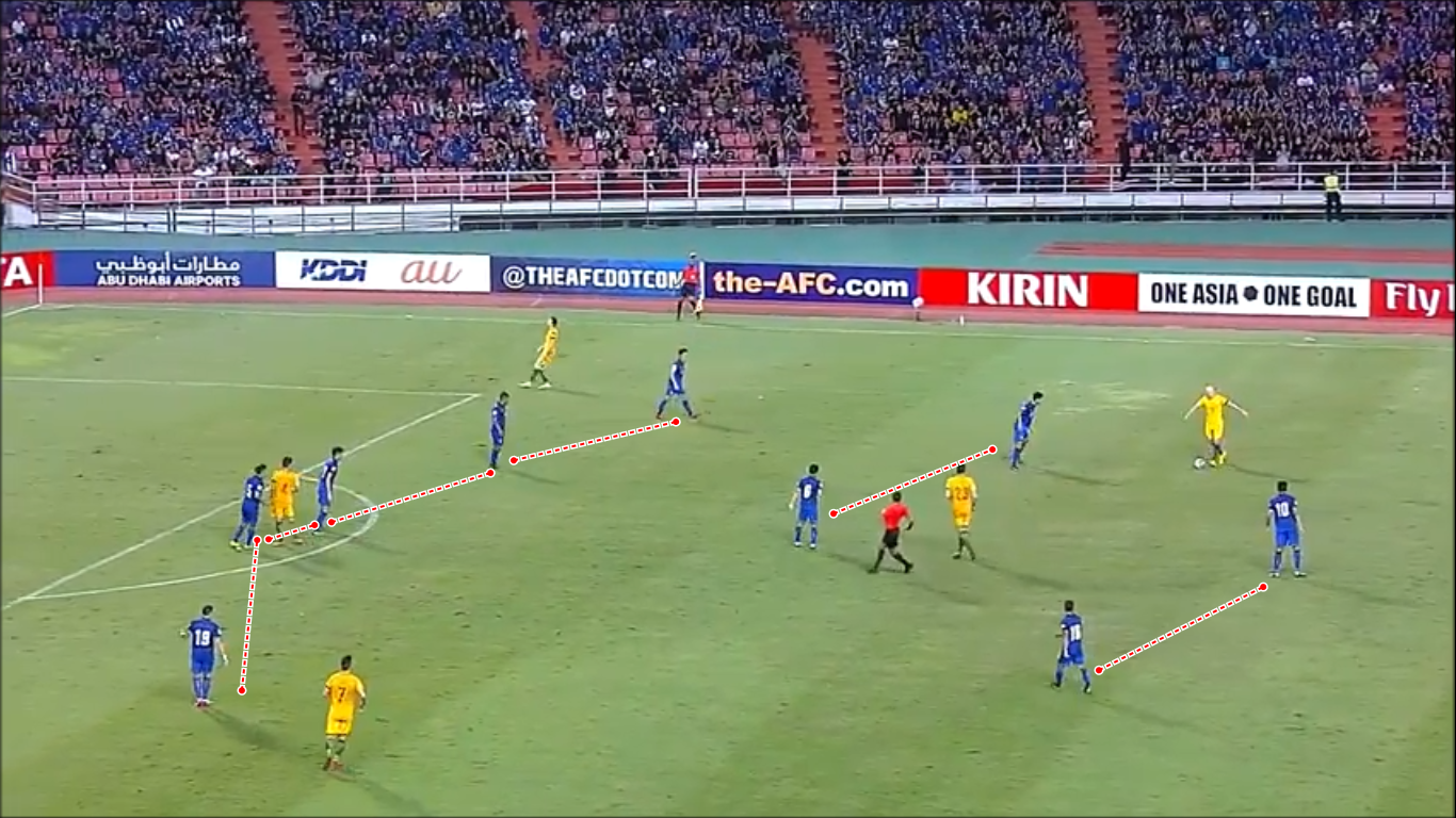 Tình huống thứ 2 là tình huống mà một số cầu thủ của Thái Lan đã chủ động dâng cao để áp sát và chặn đường chuyền lên phía trên của Australia. Lúc này cầu thủ Úc chỉ có thể chuyền về.
