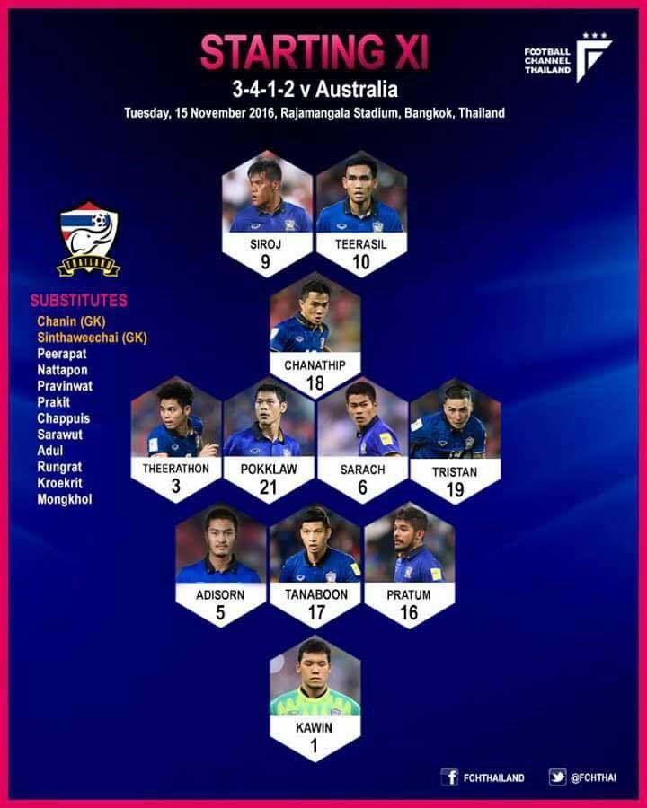 HLV Kiatisuk đã bất ngờ sử dụng sơ đồ 3-4-2-1 trong trận đấu gặp Australia và dĩ nhiên, mục đích chính là việc gia tăng quân số ở khu trung tuyến và Thái Lan muốn hạn chế các khoảng trống ở trung lộ. Ở trong sơ đồ này vai trò của cặp tiền vệ trung tâm Pokklaw Anan và Sarach Yooyen cũng như là 2 người chạy cánh Theerathon Bunmathan và Tristan Đỗ là rất quan trọng. Nếu như bộ đôi Anan và Yooyen vừa có trách nhiệm phải che chắn cho hàng phòng ngự cũng như là làm cầu nối giữa hàng thủ và hàng công. Còn Theerathon và Tristan phải lên công về thủ nhịp nhàng và họ cũng có nhiệm vụ đảm bảo cánh không bị hở cũng như là giúp dội nhà có đủ quân số khi phòng ngự.