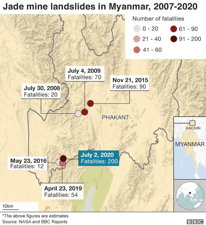 Hằng năm, vào mùa mưa, những trận lở đất chết người xảy ra gần như thường xuyên tại các mỏ ngọc ở Kachin. Chính quyền Myanmar từng ra lệnh đóng cửa mỏ trong mùa mưa, song hàng nghìn người vẫn bất chấp nguy hiểm để nhặt ngọc, bởi đó là con đường mưu sinh duy nhất.