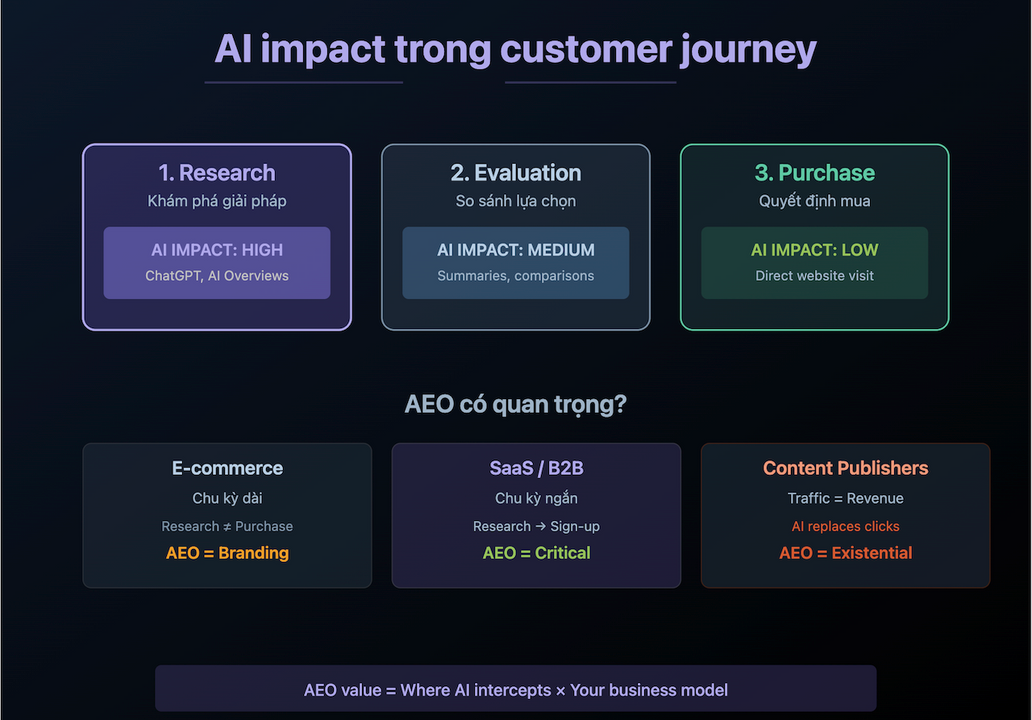 Giá trị AEO phụ thuộc vào mô hình kinh doanh, hành trình người dùng và liệu nội dung có giá trị khác biệt sống sót qua xử lý AI hay không. Với thương mại điện tử, AI chủ yếu ảnh hưởng lưu lượng đầu phễu có giá trị thấp, vì vậy AEO nên là chiến thuật branding. Với nhà xuất bản nội dung commodity, AI là đe dọa tồn tại và tối ưu không sửa được mô hình xây trên arbitrage thông tin.