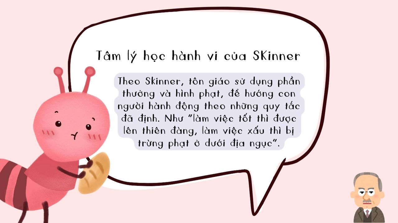 Skinner xem tôn giáo giống như một cách để điều chỉnh hành vi con người. Theo ông, tôn giáo dùng phần thưởng và trừng phạt (như “làm điều tốt thì được lên thiên đàng, làm điều xấu thì bị phạt”) để khiến con người hành động theo những quy tắc nhất định và nó giúp duy trì trật tự xã hội bằng cách hướng dẫn con người cư xử “đúng mực”.