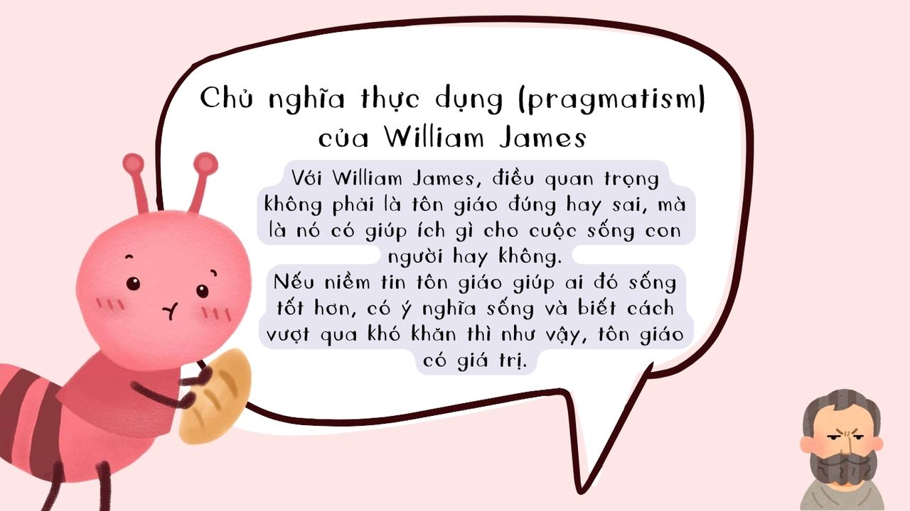 William James cho rằng tôn giáo không phải chỉ là chuyện tin vào cái siêu nhiên, mà là những trải nghiệm tâm linh sâu sắc mà mỗi người cảm nhận theo cách riêng. Với ông, điều quan trọng không phải là tôn giáo đúng hay sai, mà là nó có giúp ích gì cho cuộc sống con người hay không.
