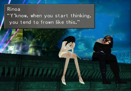 Thoại game và cả chuyện tình với Rinoa có thể hơi sến sẩm kiểu anime những năm 90 1 tí, nhưng tôi không bận tâm, cái cách chúng ta nhìn thấy Squall trưởng thành từ 1 gã cô độc đến 1 thủ lĩnh đích thực và cả là mở lòng ra với Rinoa về những vết sẹo tâm lý trong quá khứ khá ấn tượng. Cách xây dựng nhân vật nhìn qua có vẻ hơi nông nhưng thông qua side quest lẫn các chi tiết nhỏ sẽ thấy nó có rất rất nhiều điểm thú vị, mà nếu gọi là nhân vật ấn tượng nhất game chắc phải dành cho Laguna:)) Đặc biệt chơi đánh bài gây nghiện khủng khiếp.