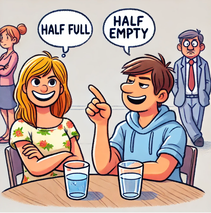 Cuộc sống mà, có người nhìn thấy ly nước nửa đầy, còn có người chỉ thấy nửa vơi. Một người thấy cơ hội, người kia lại chỉ thấy rủi ro. Và thế là... tranh luận nổ ra, căng thẳng dâng cao, ai cũng muốn mình là "chân lý."