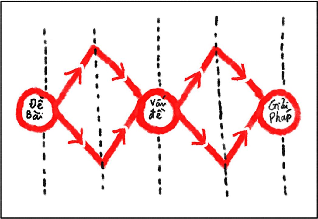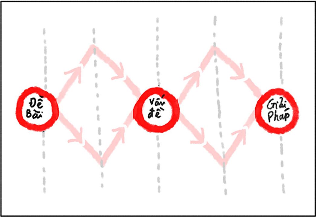 Qua ví dụ trên, bạn đã hiểu rõ về 3 cột mốc Đề bài - Vấn đề cốt lõi - Giải pháp trong một dự án thiết kế rồi chứ? Tiếp theo, ta hãy nhìn vào 2 viên kim cương xen kẽ giữa 3 cột mốc. Mỗi viên kim cương này là một con đường tư duy dẫn ta đi từ cột mốc này sang cột mốc kia. Từ đề bài, ta cần đi đến vấn đề cốt lõi, và từ vấn đề cốt lõi, ta cần đi đến giải pháp.