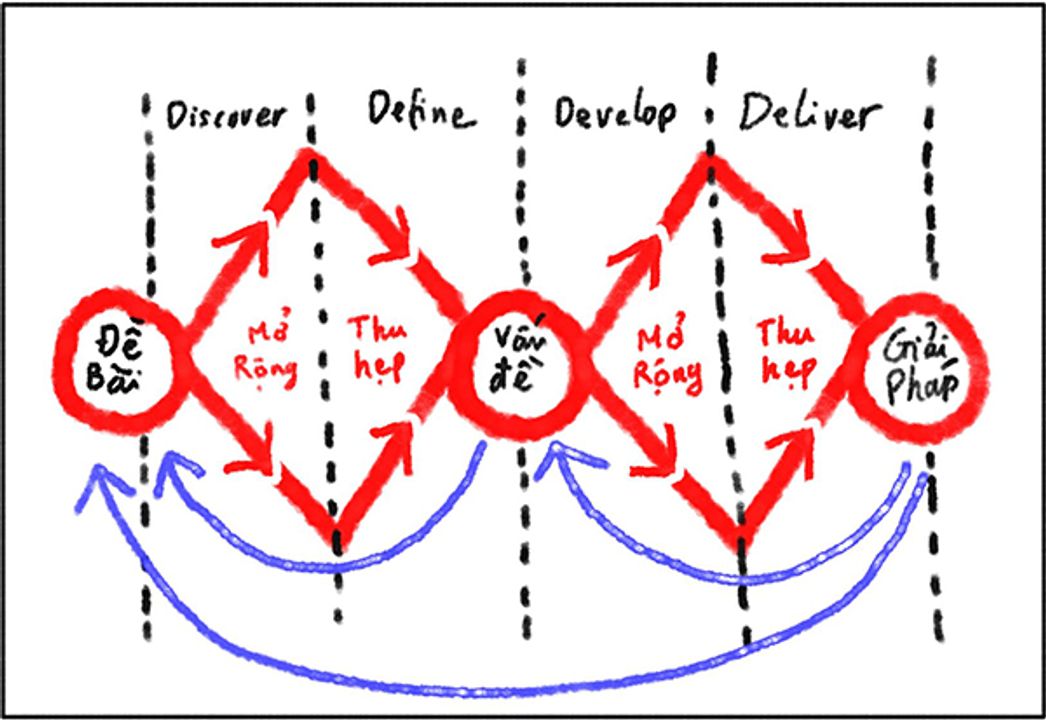 Thực tế, ở quy mô lớn hơn (như thiết kế trải nghiệm người dùng), bạn sẽ thấy Double Diamond lặp đi lặp lại nhiều lần trong suốt vòng đời sản phẩm. Mỗi khi có insight mới → lại quan sát mở rộng (Discover) → xác định lại vấn đề (Define) → tìm hướng cải thiện (Develop) → và kiểm nghiệm giải pháp (Deliver), rồi lại lặp lại quy trình (Do-it-again).