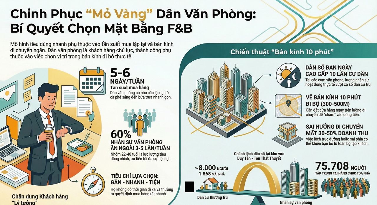 Vì mô hình tiêu dùng nhanh sống bằng 3 thứ rất rõ: mua lặp lại mỗi ngày, quyết định nhanh và bán kính di chuyển ngắn. Dân văn phòng đi làm 5–6 ngày/tuần. Sáng cần cà phê. Trưa cần bữa ăn gọn lẹ. Chiều cần ly nước. Họ không có thời gian đi xa hay suy nghĩ quá nhiều. Họ chọn gần – nhanh – tiện.