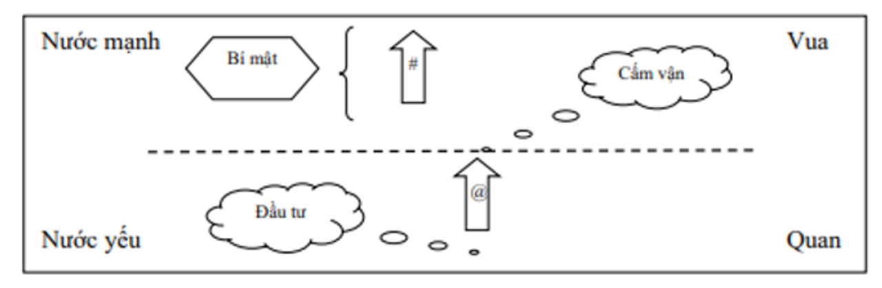 Có 3 cách để tăng khoảng cách giữa # và @, đầu tiên đó là cải thiện gia tốc phát triển của # so với @; thứ 2 làm # tăng đồng thời làm @ giảm và cuối cùng là khiến cho @ tự quy hàng vì khoảng cách quá lớn mà lùi lại hay “quỳ xuống”. Đa phần các nước lớn thường chọn cách thứ 2, chặn không cho @ tăng bằng cách cấm vận từ quân sự tới kinh tế. Khi @ đói không chịu được phải ngoại giao để cầu thực thì họ bắt đầu phương pháp đầu tư để kéo @ xuống bằng những khoản nợ, điều khoản ràng buộc chặt chẽ. Khi đã đói rồi thì chúng ta không có vị trí để đòi hỏi… Mối quan hệ giữa tương quan hơn kém giữa # và @ không chỉ đúng ở quan hệ quốc tế mà nó còn hiện diện ở trong nước, đặc biệt là trong bộ máy chính trị nơi được gắn liền với sức mạnh quyền lực. # là vua, @ là quan, không phải vị vua nào cũng là người giỏi hơn bá quan văn võ đang phục vụ mình. Nhưng vì ngồi ở một chức vụ cao tựa trời xanh, nên đôi lúc dù có thua kém nhưng vẫn phải gồng mình để tạo ra góc nhìn thứ 3 thật hoàn hảo trong mắt bá quan văn võ. Cùng với tính chất phản nghịch đối chiếu trong hình học 2 chiều, hoặc # tiến lên không thì @ phải lùi xuống để có thể giữ được “quyền lực”. Góc nhìn thứ 1 và góc nhìn thứ 3 không khớp lệnh, đó là lúc những lời khen, tán dương phải được thốt ra để thỏa mãn góc nhìn thứ 3 mà nhà vua muốn nhận lại. Nịnh thần và hôn quân luôn là lẽ tất yếu với một quốc gia có thực lực kém…