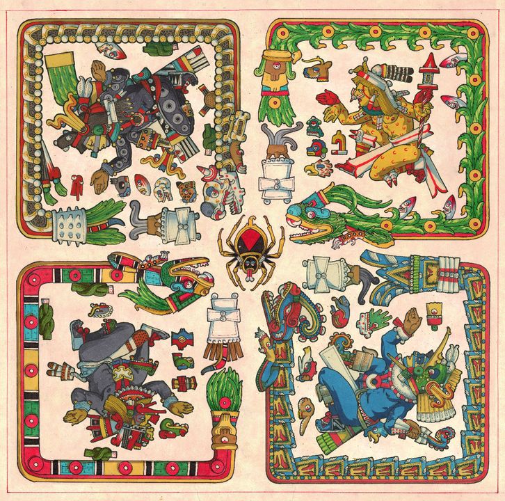 Nền văn minh Aztec chịu ảnh hưởng sâu sắc từ những nền văn hóa đi trước và sở hữu một hệ thống thần thoại phong phú. Theo thần thoại Aztec, thế giới khởi nguồn từ Ometeotl – vị thần lưỡng tính mang cả hai bản thể nam và nữ, được gọi là Ometecuhtli (Thần Cha) và Omecihuatl (Thần Mẹ). Từ cuộc hôn phối này, họ sinh ra bốn người con trai: Xipe Totec, Tezcatlipoca, Quetzalcoatl và Huitzilopochtli. Cả bốn vị thần đều mang danh hiệu “Tezcatlipoca” với bốn sắc thái khác nhau – Đỏ, Lam, Đen và Trắng. Dù có nhiều dị bản về thần thoại, phiên bản phổ biến nhất vẫn cho rằng cả bốn anh em đã cùng nhau kiến tạo thế giới.