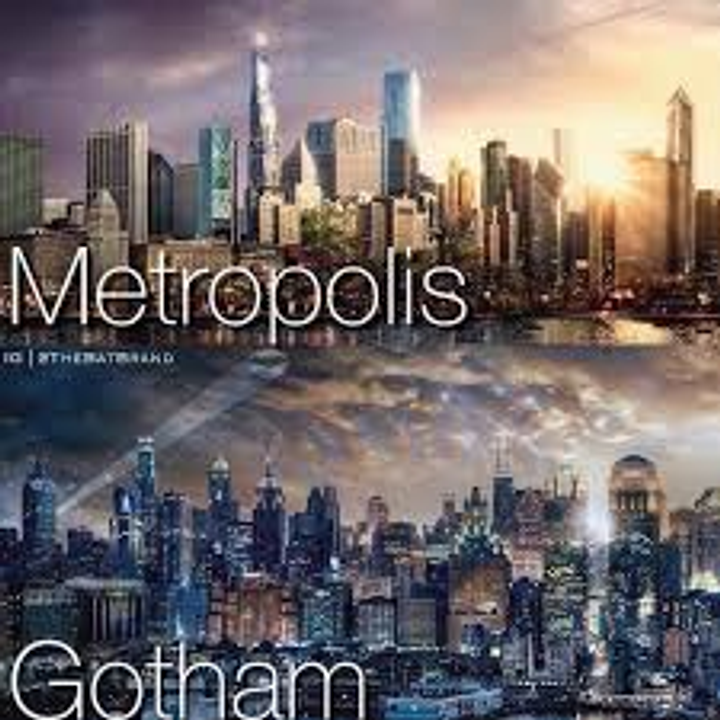 _ Gotham là một thành phố tối tăm, u ám, đầy rẫy tội ác và những người đã mất niềm tin vào công lý. Đối lập với đó, Metropolis là một thành phố sáng sủa và là biểu tượng của hy vọng, nơi Superman hoạt động như một biểu tượng của công lý và sức mạnh tuyệt đối.