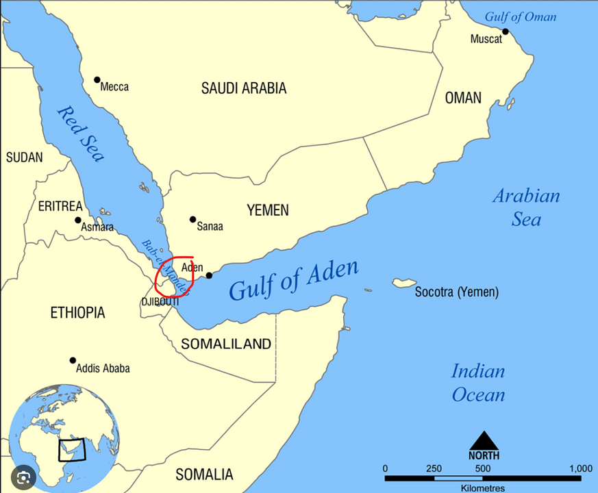 Đây là eo biển Bab-el-Mandeb, hay còn được biết đến là “cổng nước mắt”, là một nút thắt hàng hải quan trọng, nối trực tiếp qua kênh đào Suez, và là cửa ngõ giữa Châu Á và Châu Âu. Mỗi ngày, lượng hàng hóa đi qua tuyến đường này có giá trị từ 3 đến 9 tỷ đô la, và chiếm 12% tổng giá trị hàng hóa toàn cầu thông qua đường biển.