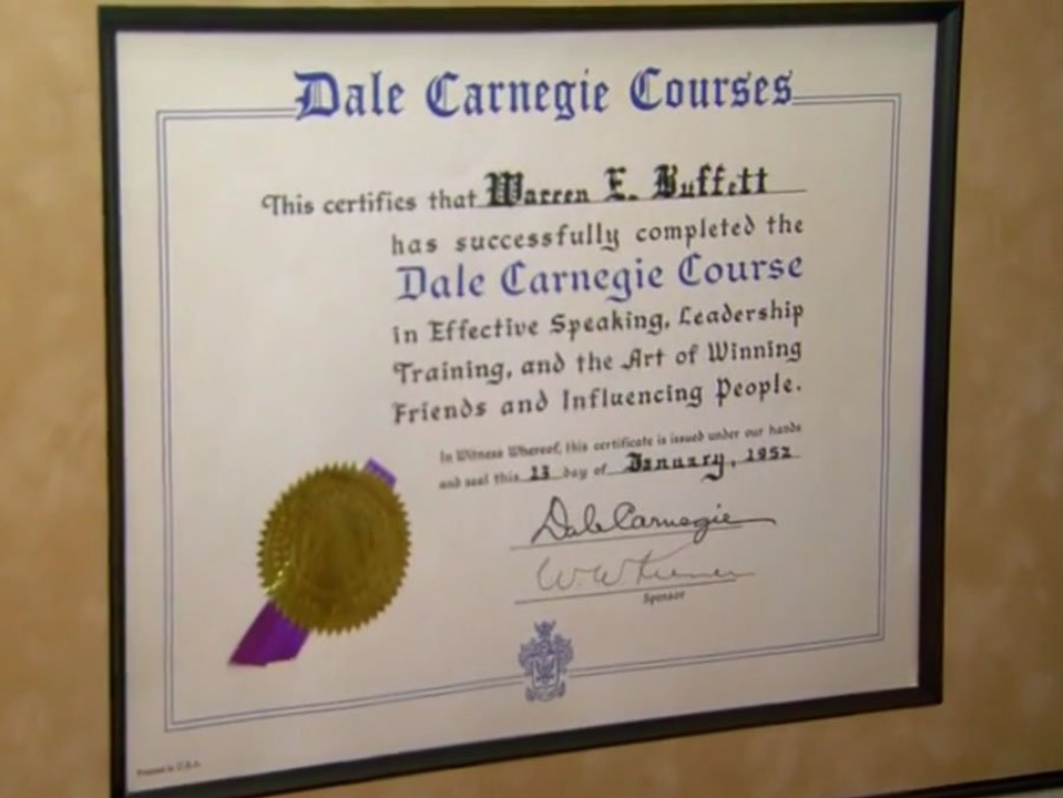 Cho đến tận ngày nay, nếu bước vào văn phòng làm việc của Buffett tại Omaha, bạn sẽ không tìm thấy tấm bằng Thạc sĩ Kinh tế của Đại học Columbia hay Đại học Nebraska được treo trên tường. Ở vị trí trang trọng nhất, chỉ có duy nhất một tờ giấy: Chứng chỉ tốt nghiệp khóa học Dale Carnegie, đề ngày 13 tháng 1 năm 1952. .